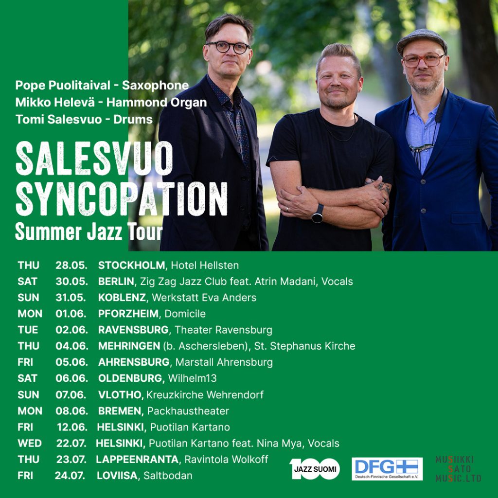 Tule nauttimaan kesäillasta idyllisellä sisäpihallamme laadukkaan ruoan, juoman ja jazz-sävelien parissa. Svengaavaa akustista jazzia meille tulee tarjoilemaan Salesvuo Syncopation kokoonpanon raudan lujat taiturit Petri Puolitaival (saksofoni), Mikko Helevä (Hammond urut) ja Tomi Salesvuo (rummut).